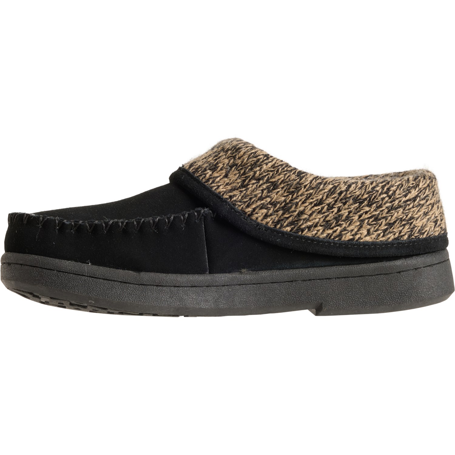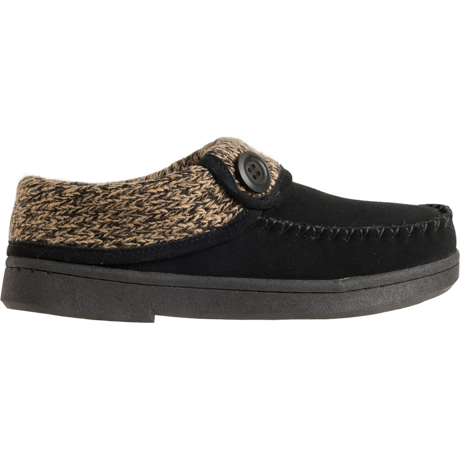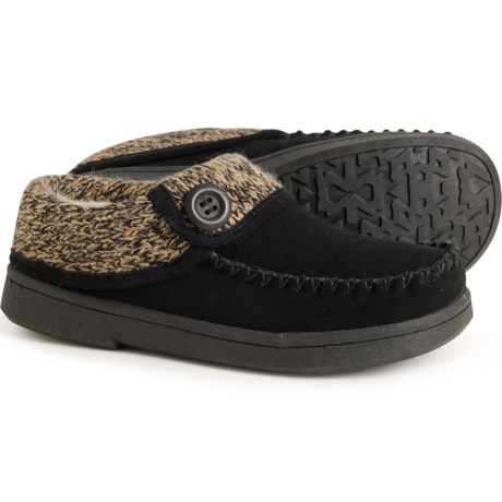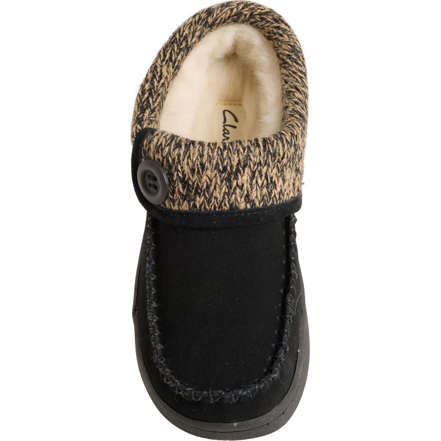 Closeout. Pamper cold, tired feet with these Clarks moccasin slippers, featuring a knit collar and lining for underfoot warmth and comfort.