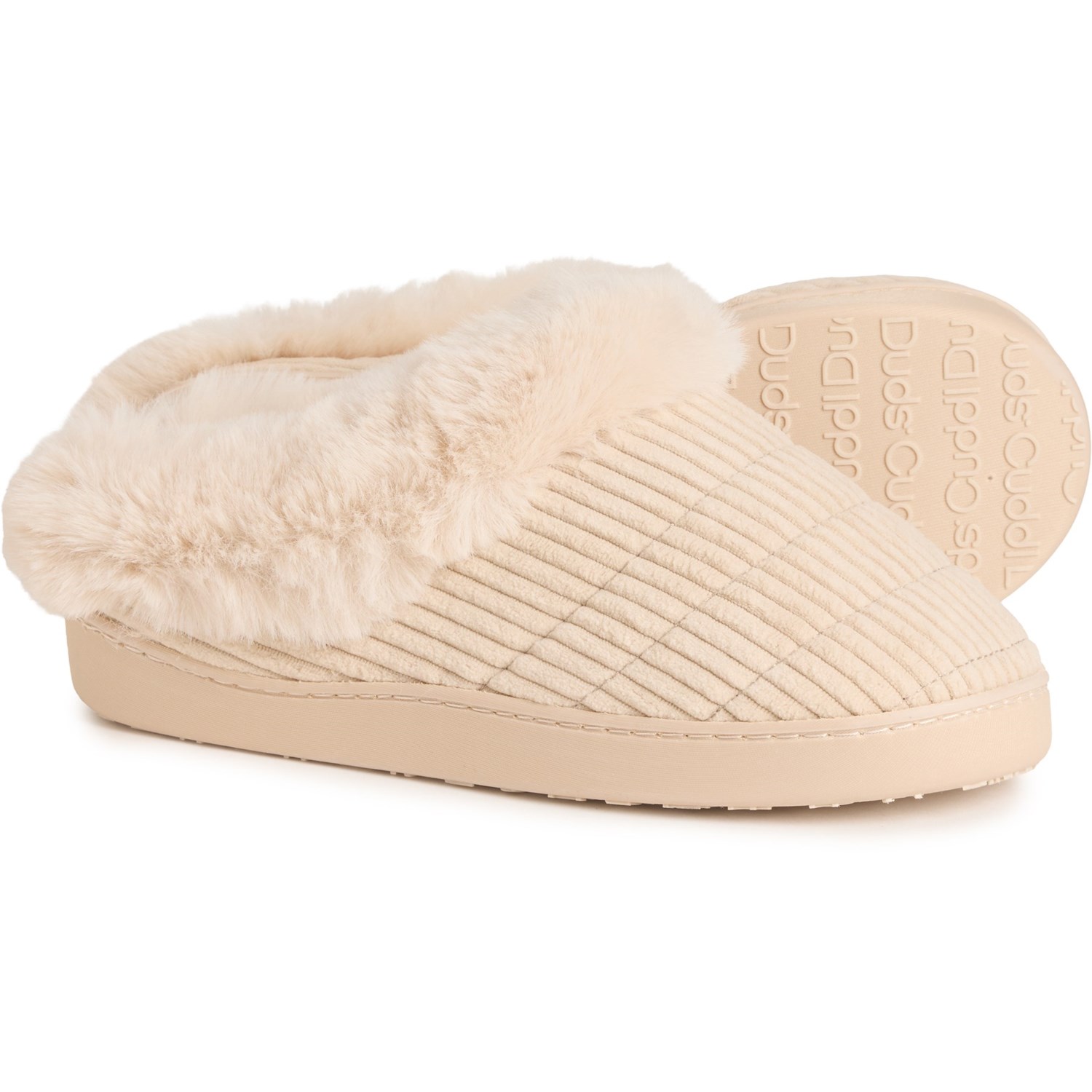 Excess. Keep your feet cozy on cold nights with Cuddl Duds' corduroy faux-fur cuff slippers, made from soft corduroy with a fuzzy faux-fur lining and cushy foam footbed.