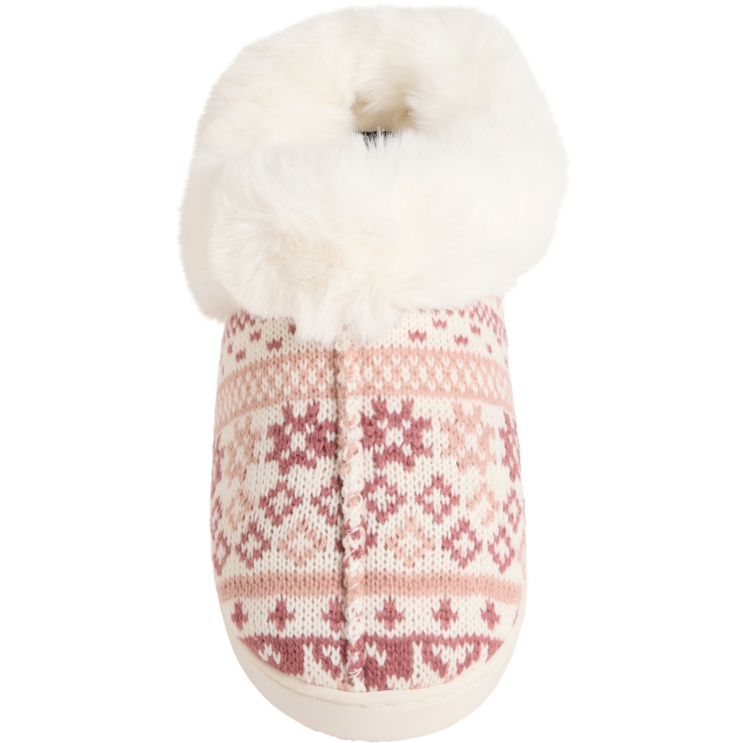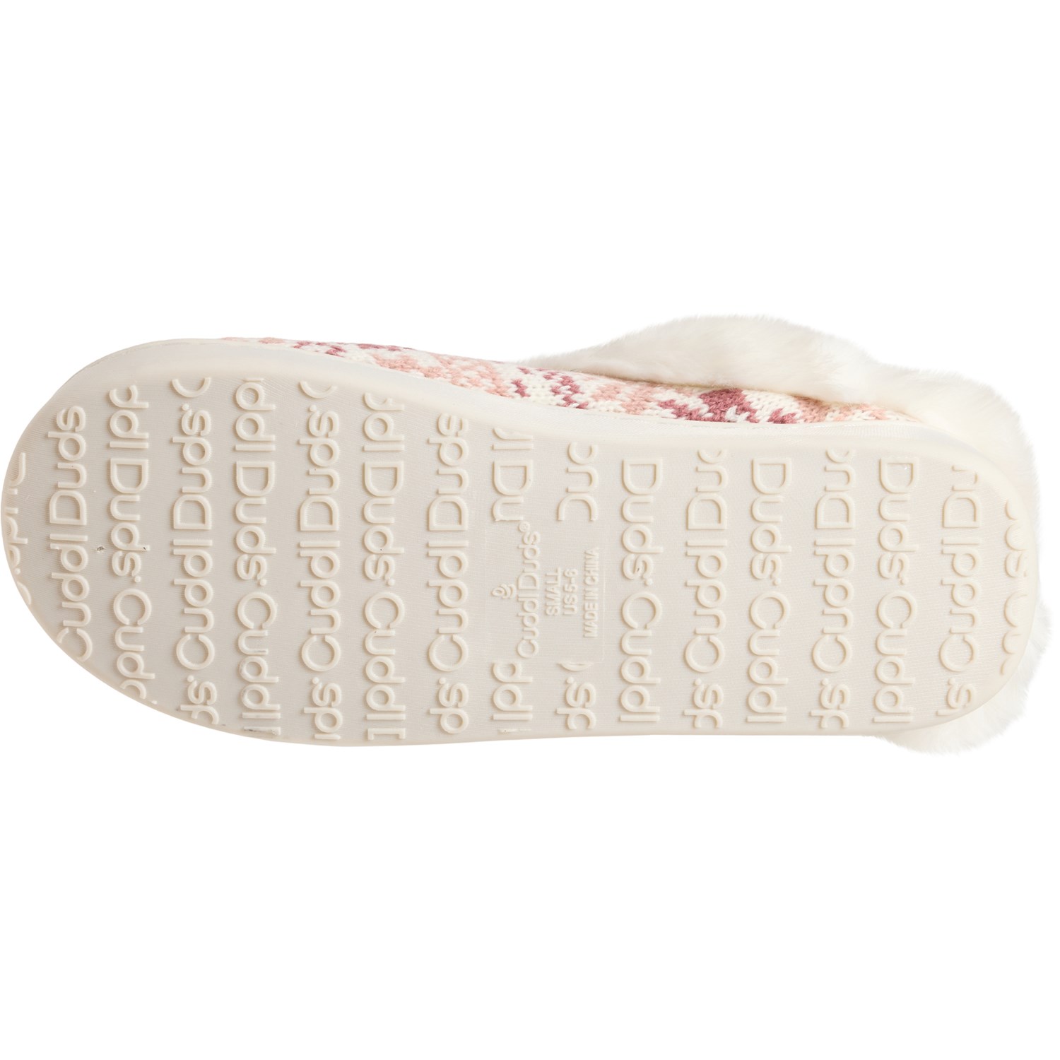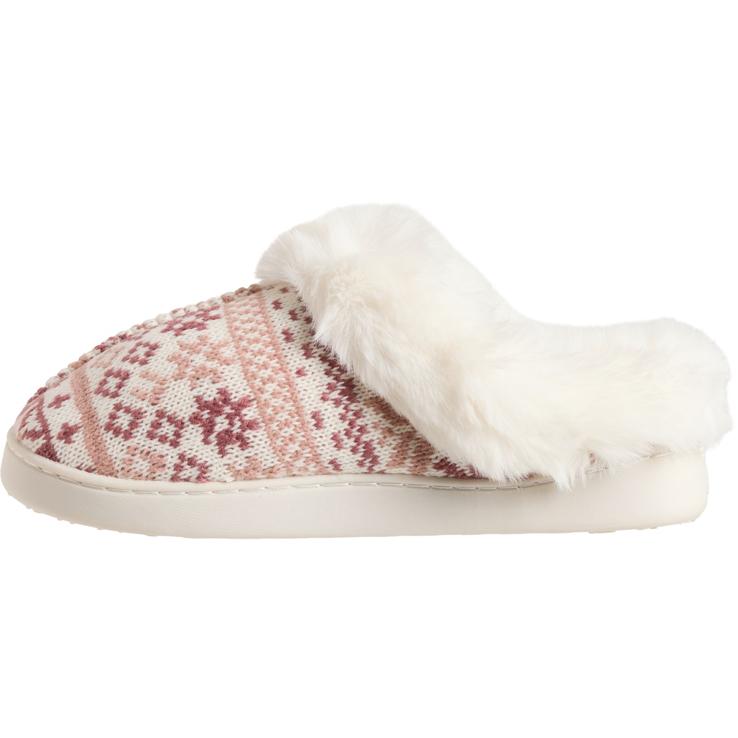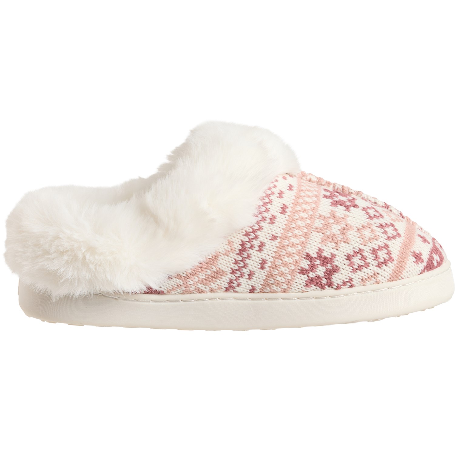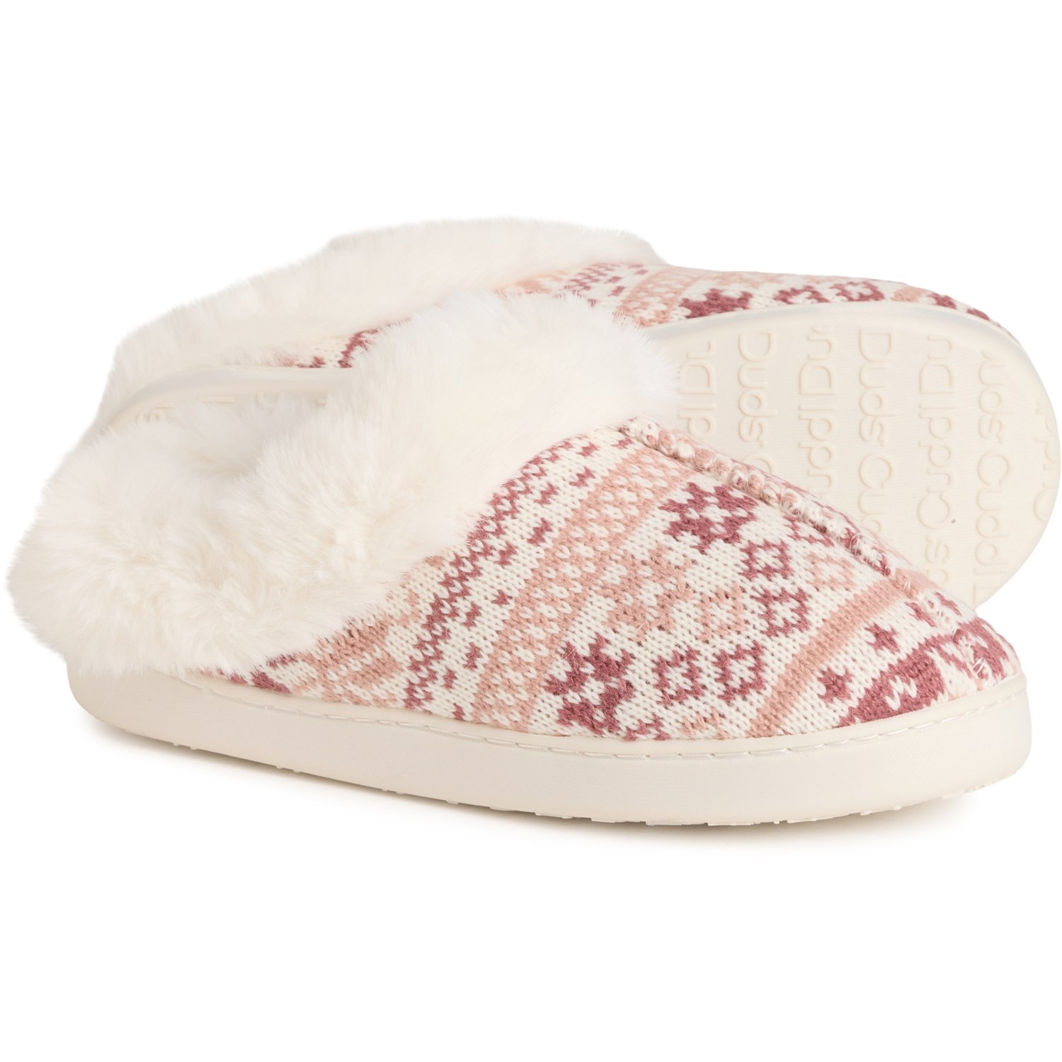 Excess. Treat your feet on cold days with these Cuddl Duds Fair Isle knit slippers, crafted in supersoft knit fabric with a plush faux-fur lining and a cushioned footbed for ultimate comfort.