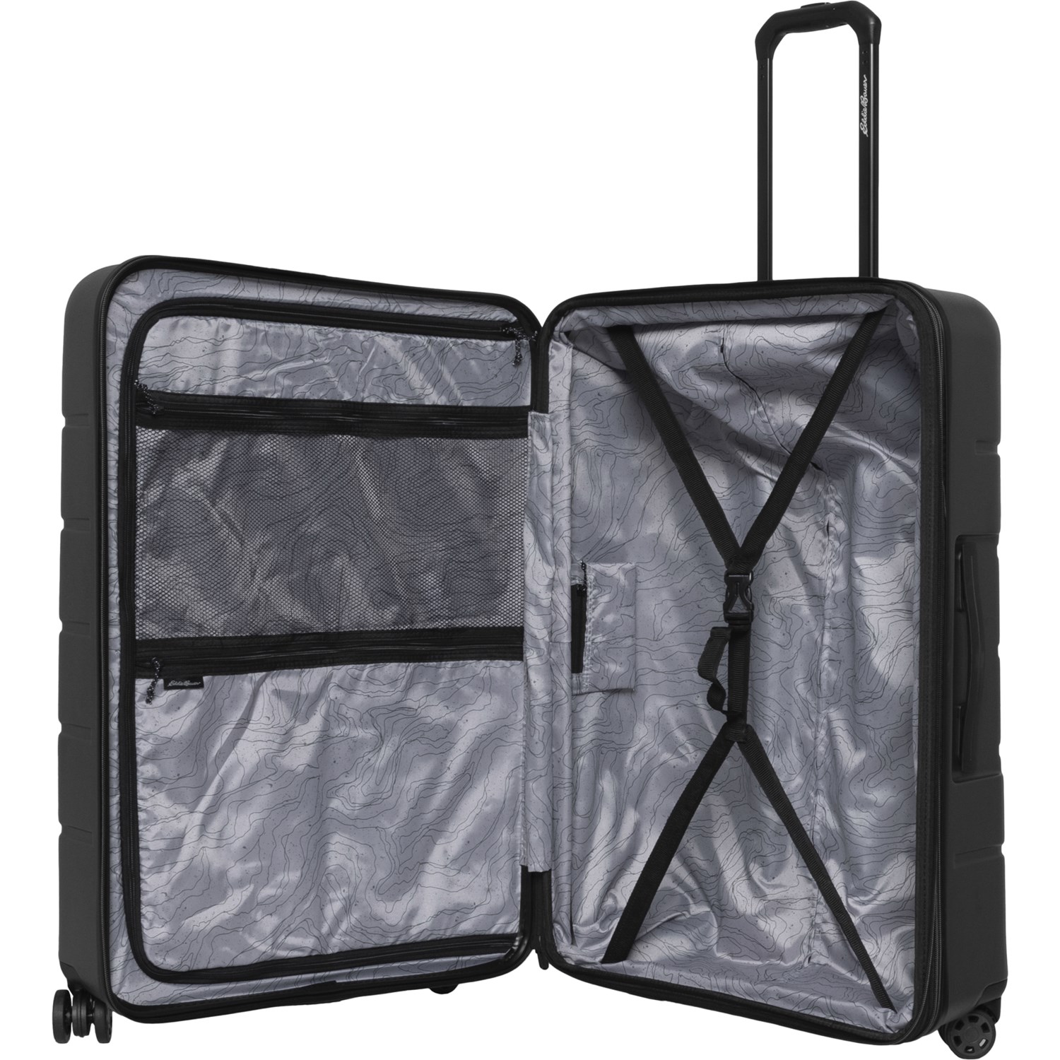 Excess. Easily make your way through busy airports with Eddie Bauer's Glacier hardside spinner suitcase, featuring a durable polycarbonate shell, inner pockets and 360-degree double-spinner wheels for a smooth ride.