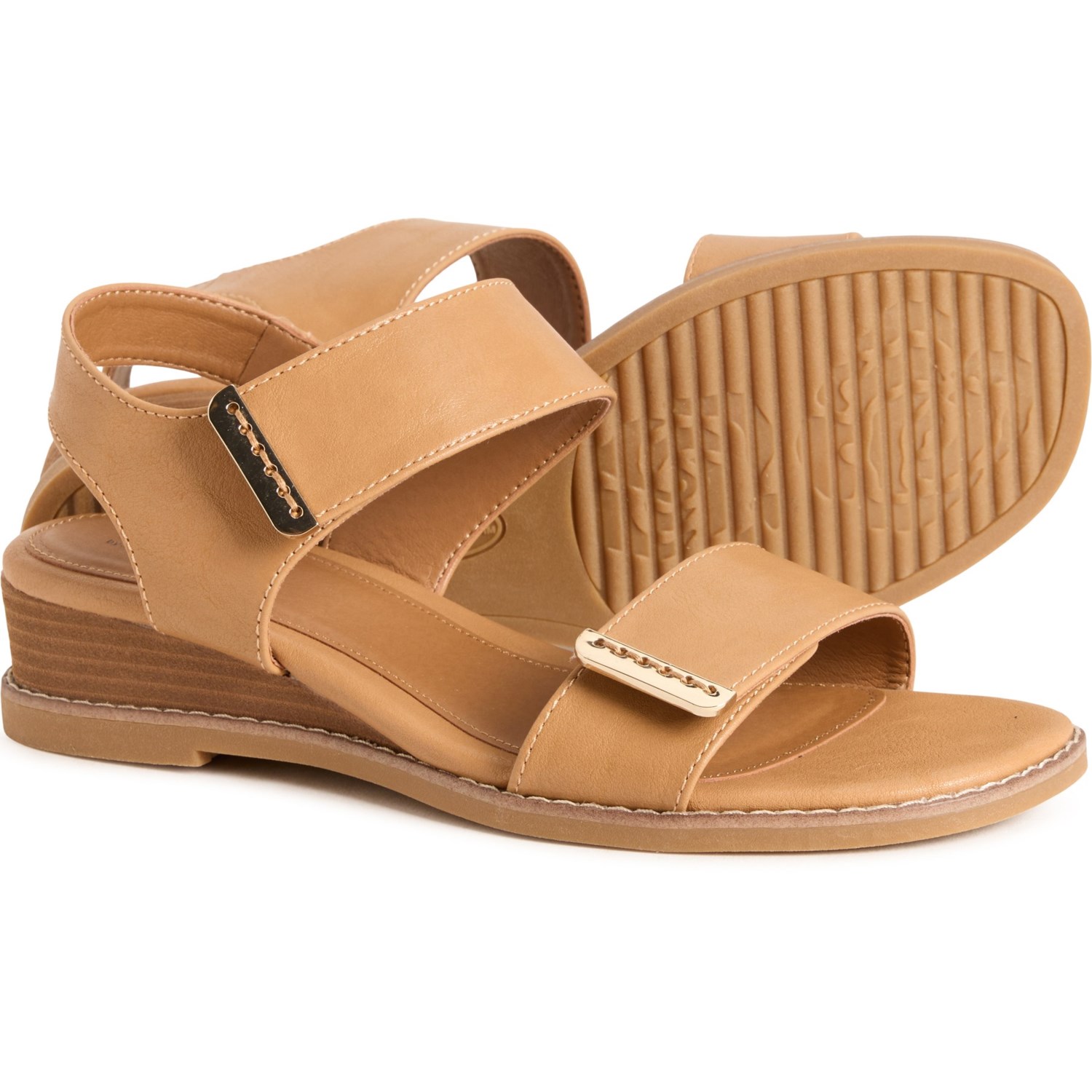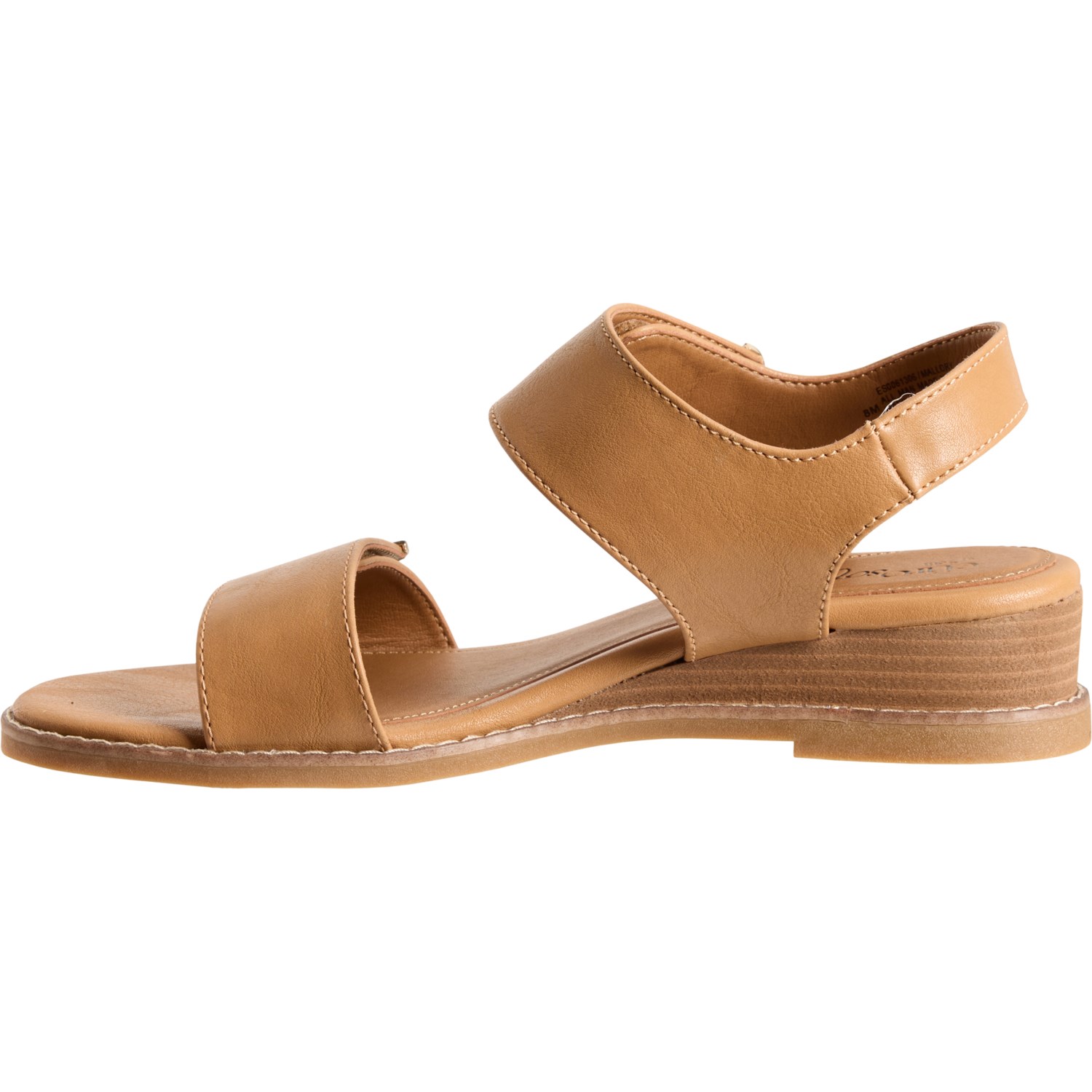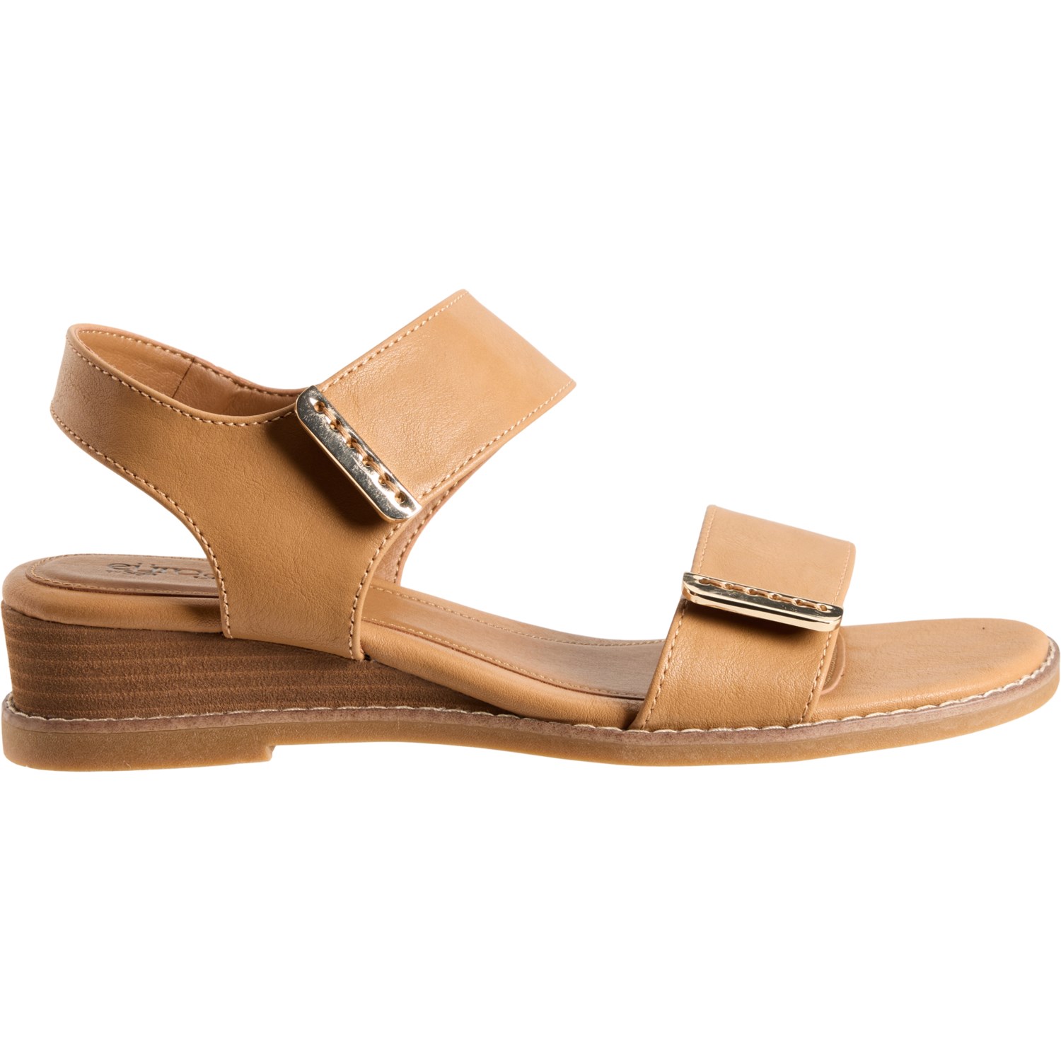 Closeout. Step out in comfort and style with these Eurosoft by Sofft Mallory 2-band ankle strap sandals, crafted in soft synthetic leather with a cushioned footbed, stack wedge heel and flexible outsole.