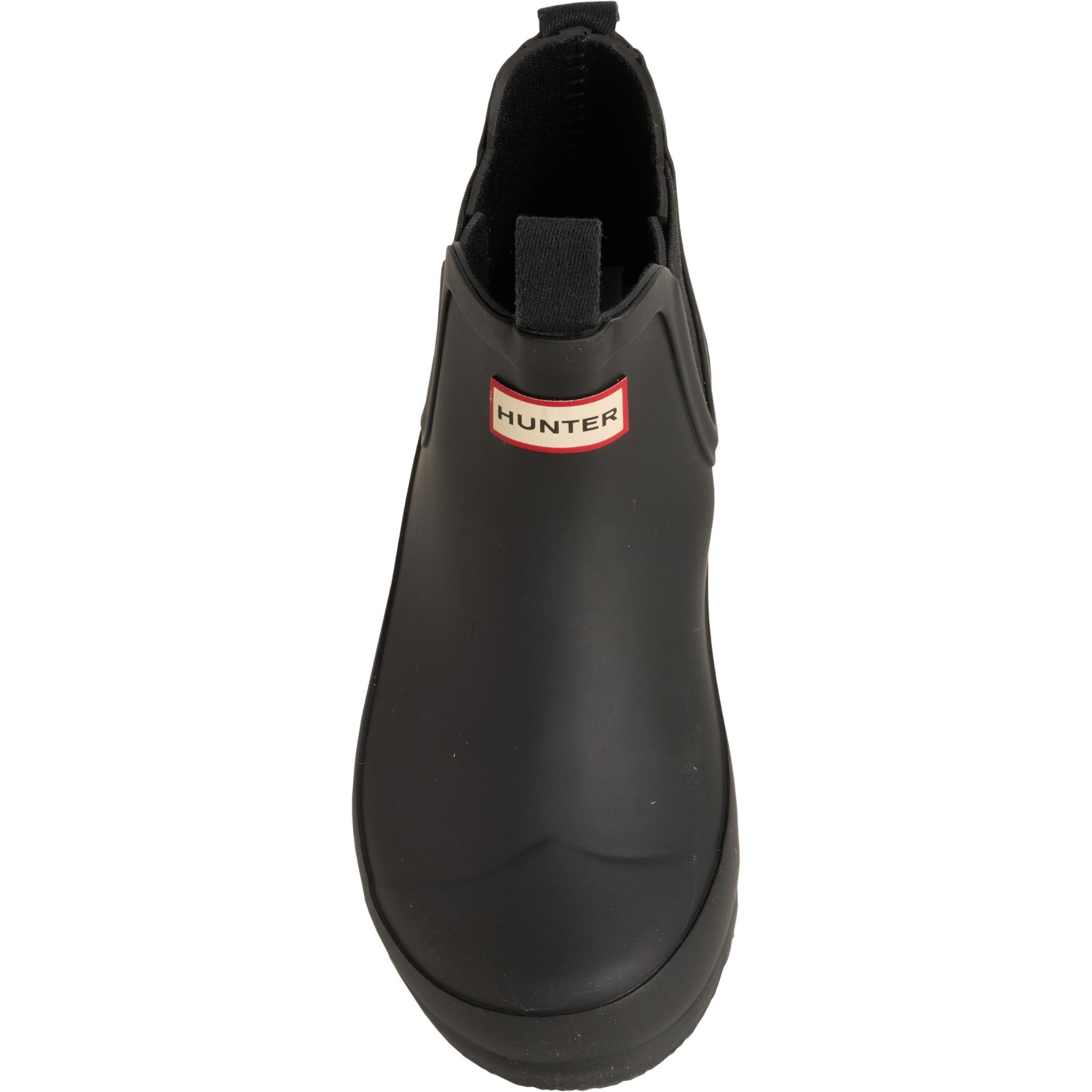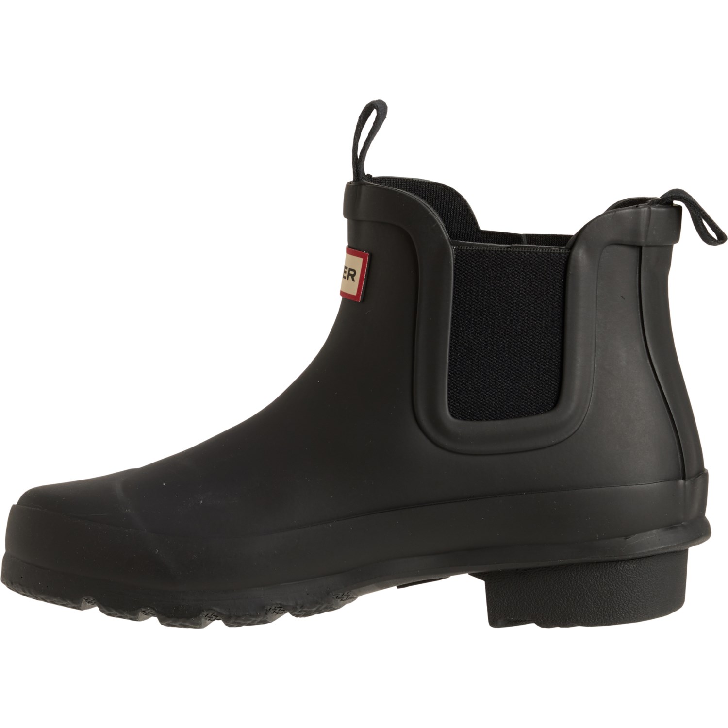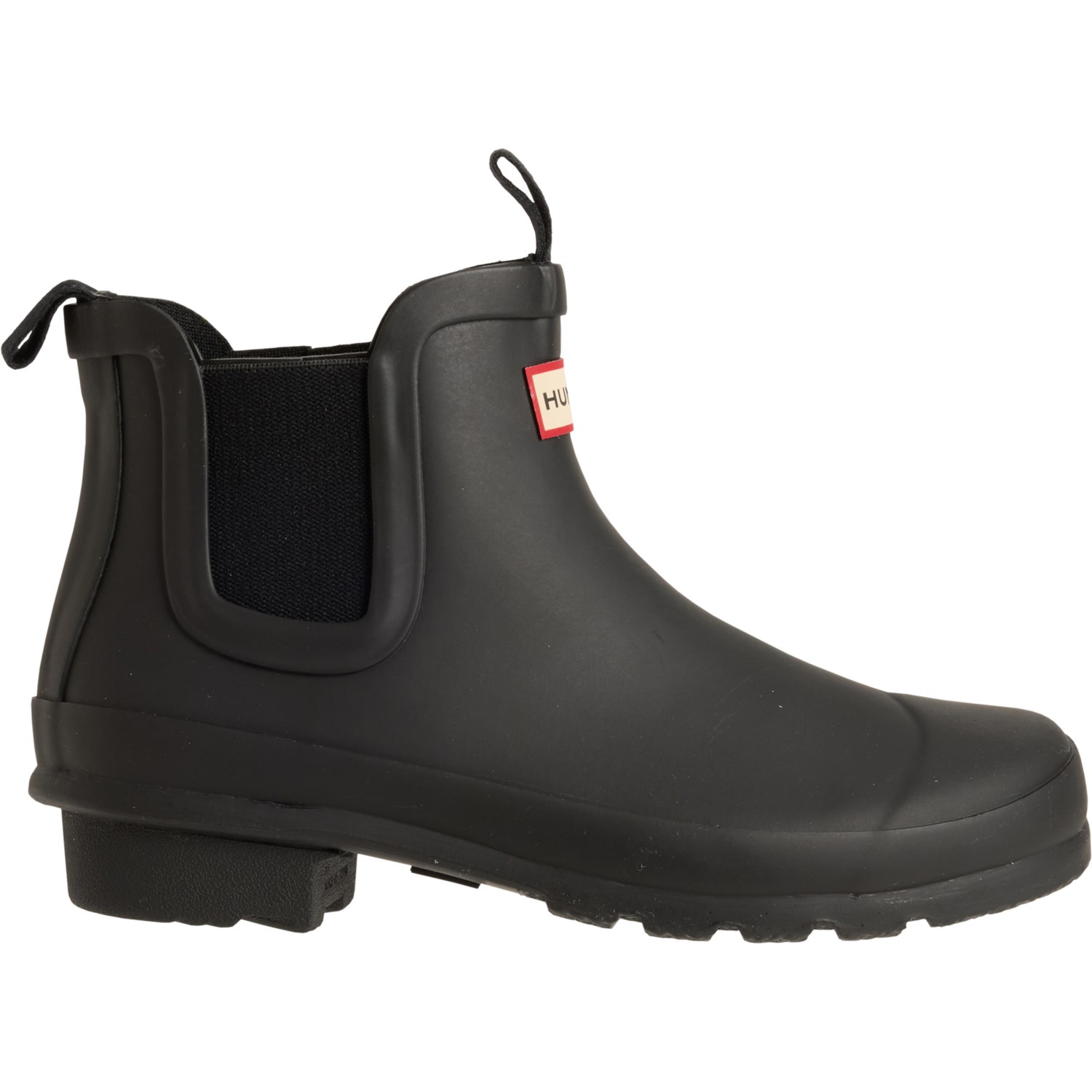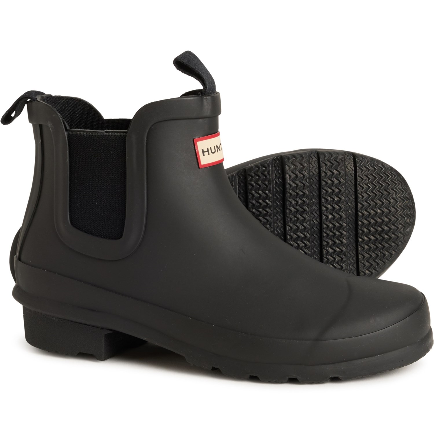 Closeout. They'll be ready to splash and stomp through the rain with HUNTER's Original Chelsea rain boots, made from waterproof rubber with a grippy outsole and classic style.