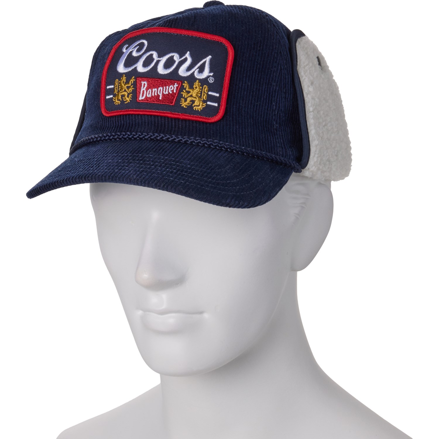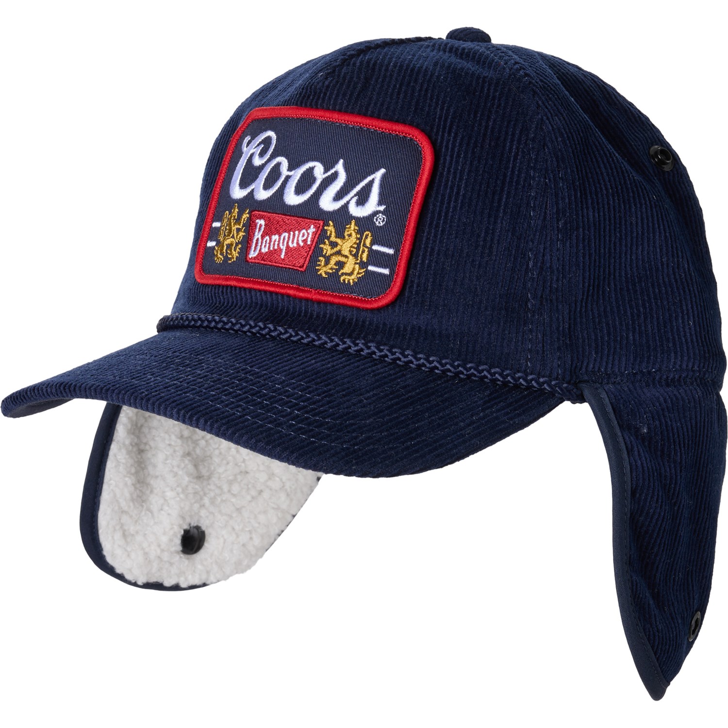 Closeout. Keep the heat in on cold days with Mad Engine's Coors Banquet trapper hat, crafted with a soft cotton corduroy shell, and lined with cozy fleece. Features fleece-lined ear flaps that can be worn up or down for added protection.
