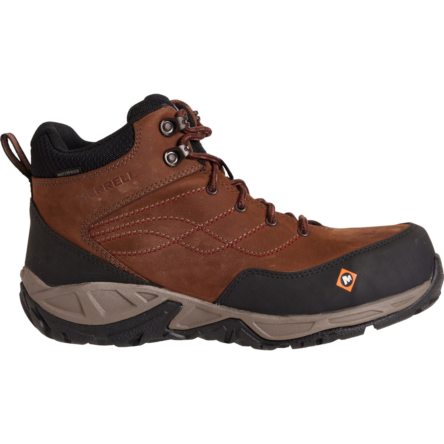 Closeout. Merrell's Siren LTR mid work boots keep feet dry and comfortable at tough job sites so you can stay focused on the task at hand. They are crafted from waterproof materials with a protective alloy safety toe.