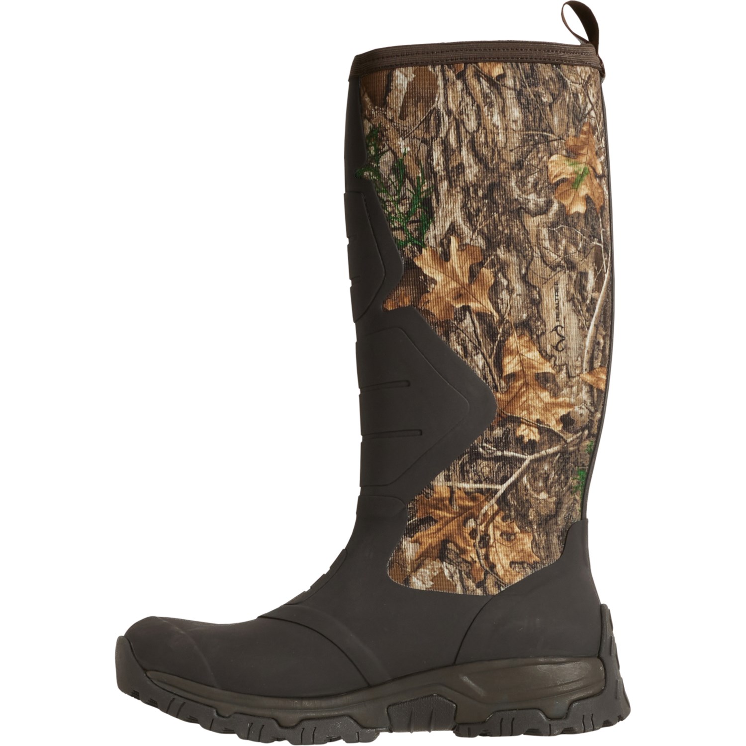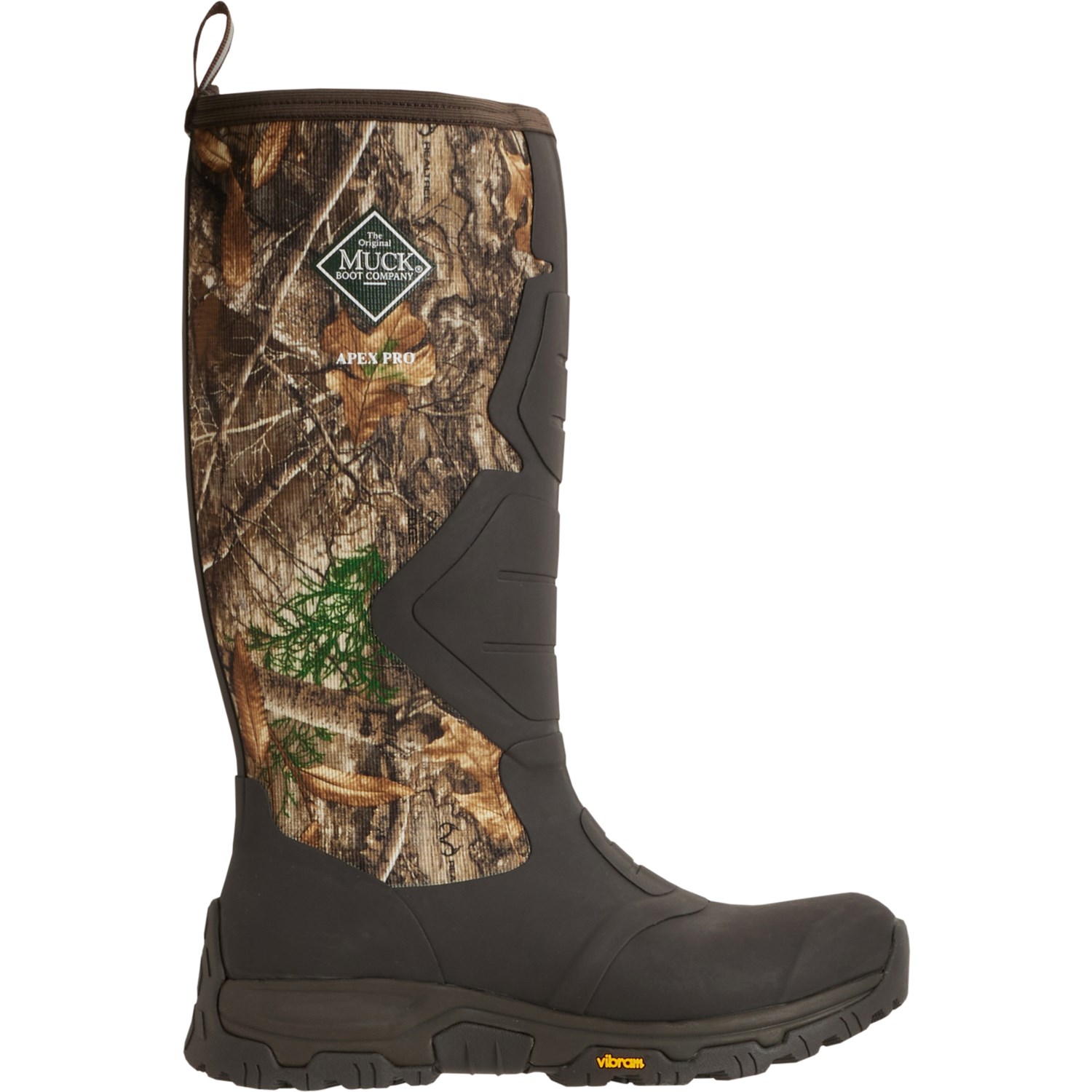 Closeout. Keep your feet warm and dry while out in the field with Muck's Apex Pro boots, crafted in waterproof breathable and insulating neoprene with protective rubber overlays, a thermo-regulating fleece lining, grippy, durable Vibram® outsole and a Realtree® Edge camouflage print to help keep you concealed.