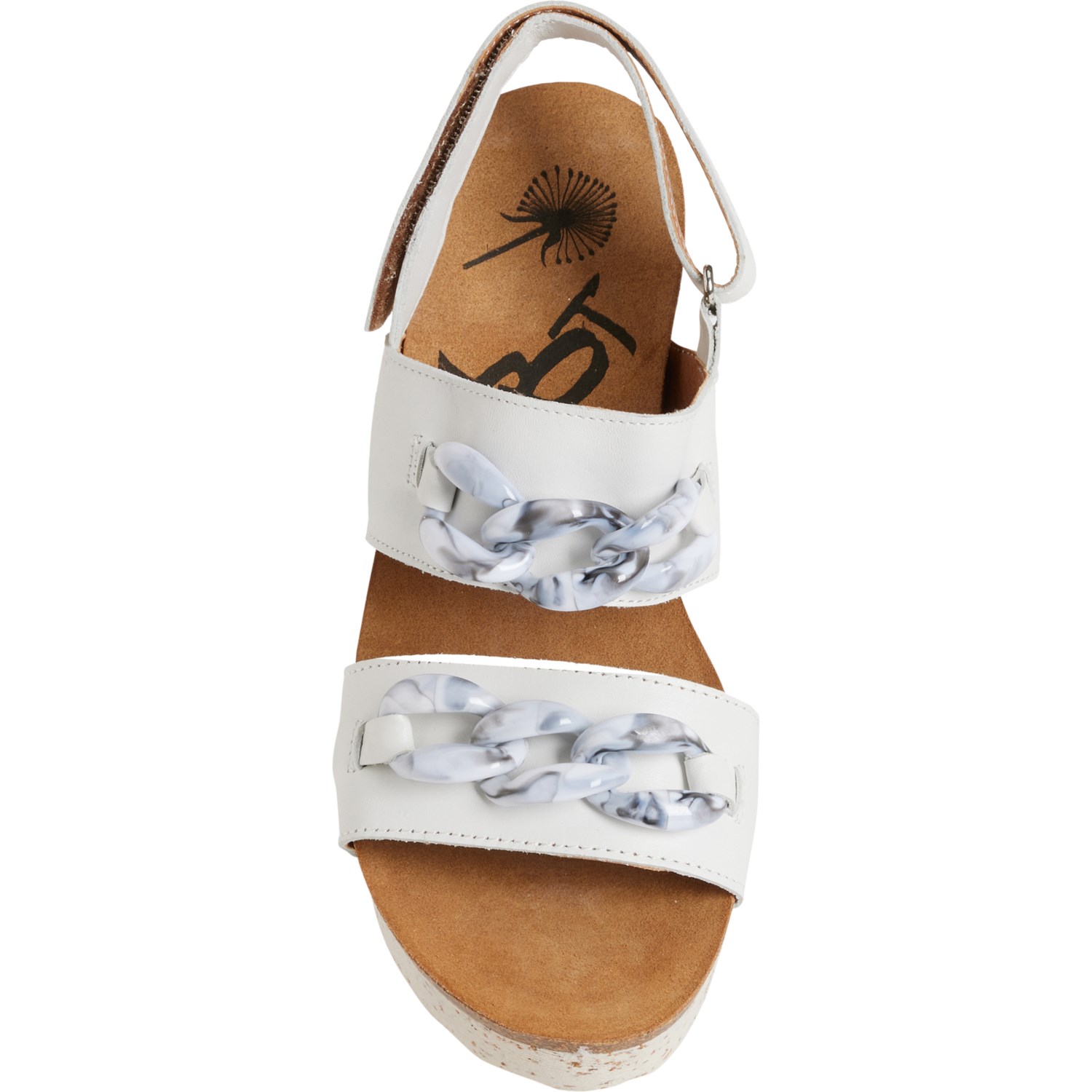 Closeout. Add some height and show off your pedicure with these OTBT Fair Isle wedge sandals, crafted from smooth leather with pretty chain detail, a contoured cork footbed, a wedge heel and a strappy design.