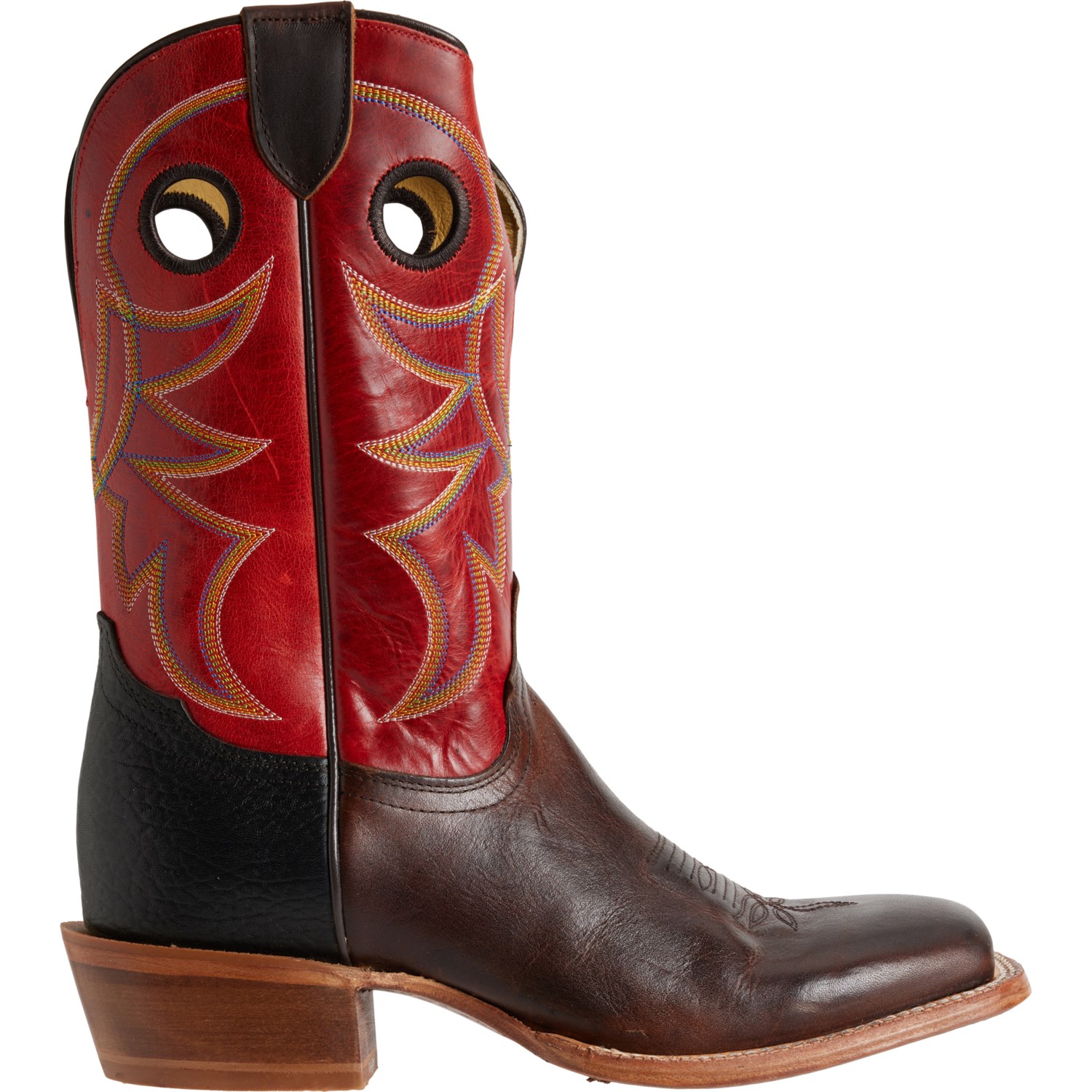 Closeout. From the ranch to the dance hall, you'll love the style and functionality of Tony Lama's Ronan western boots. They're crafted in two-toned cowhide leather with intricate stitching detail, a shock-absorbing footbed and a wide square toe for added comfort with extended wear.