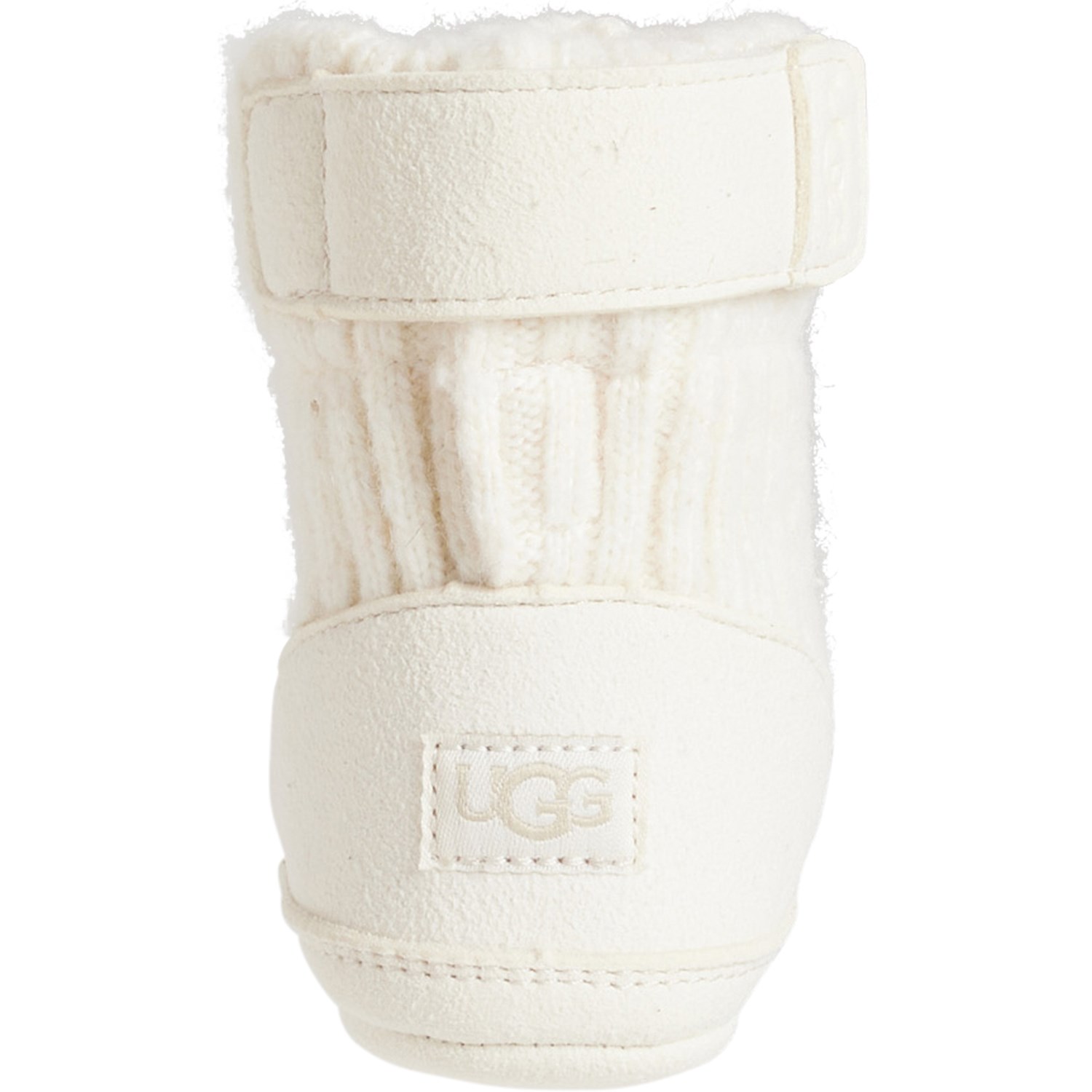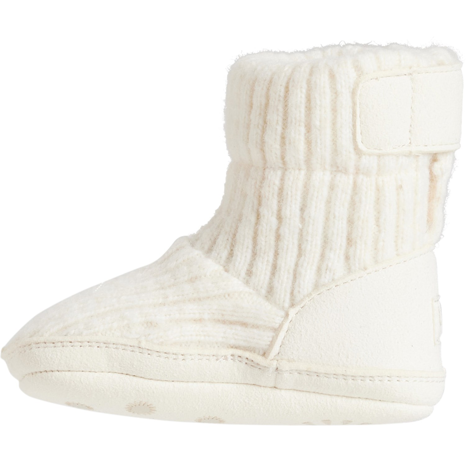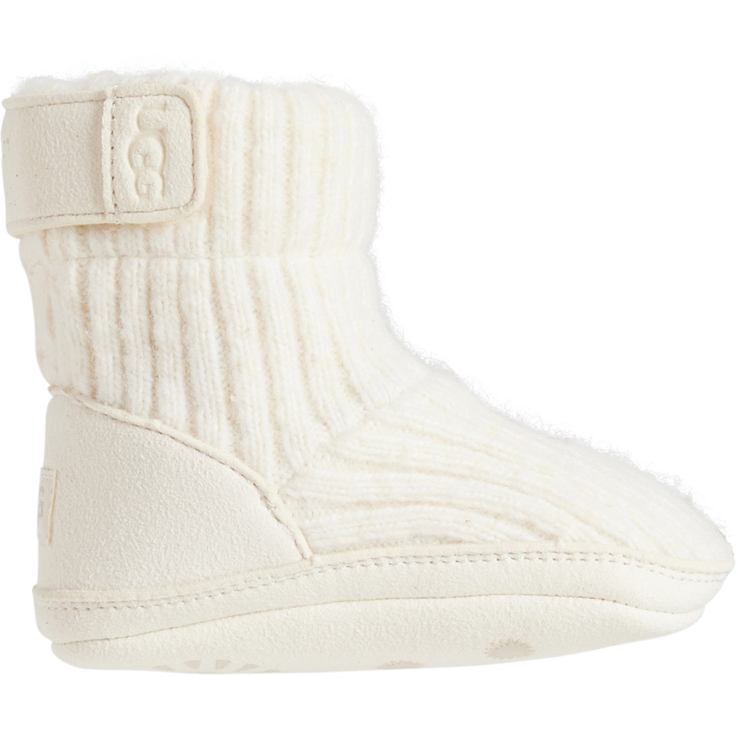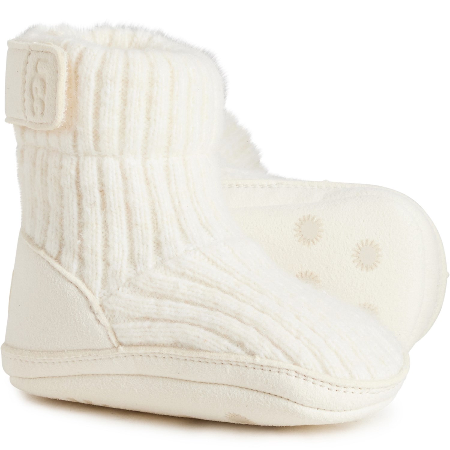 Closeout. Keep the littlest feet warm with these UGG® Skylar booties, made from soft rib-knit fabric with slip-resistant rubber printed soles.
