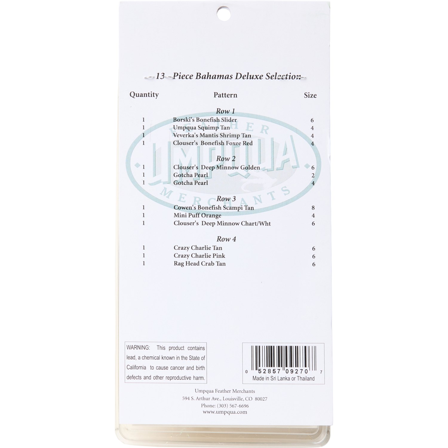 Closeout. Hand-tied to exacting standards and crafted of high-quality materials, UMPQUA's Bahamas Deluxe fly selection set helps anglers enjoy a successful day on the water.